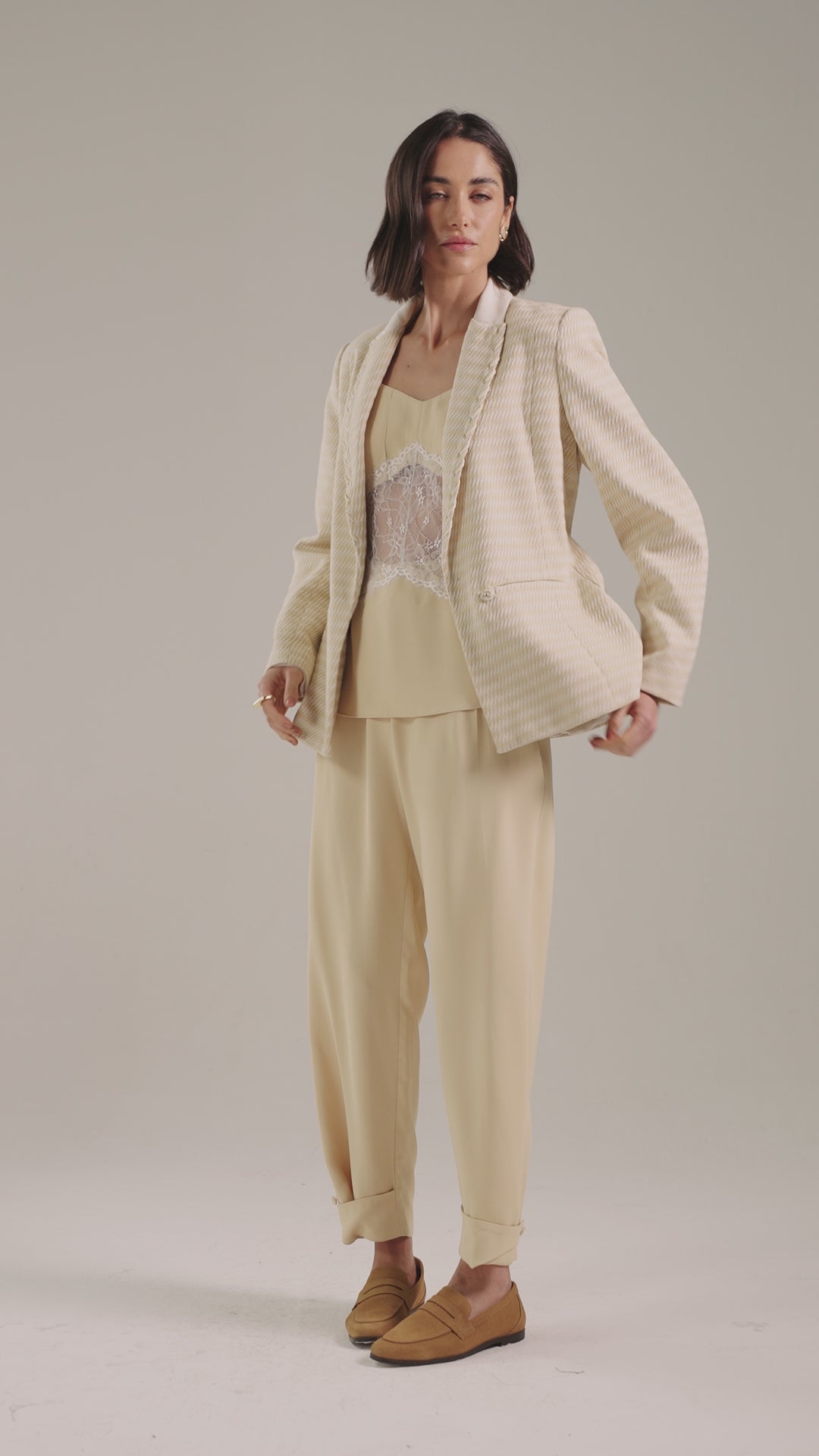O blazer Nina é confeccionado em tecido plano de gramatura média e toque encorpado. Destaca-se por sua superfície levemente irregular e rústica, característica dos fios utilizados, que confere autenticidade e textura ao visual final da peça. Proporciona um caimento estruturado, com apelo artesanal e sofisticado. Apresenta modelagem regular e acinturada, com recortes que garantem um ajuste impecável. A gola é confeccionada em tecido de alfaiataria de viscose, com caimento levemente encorpado e toque macio. A peça conta ainda com detalhe de alinhavo em fio de camurça na lapela, adicionando um toque artesanal e refinado.