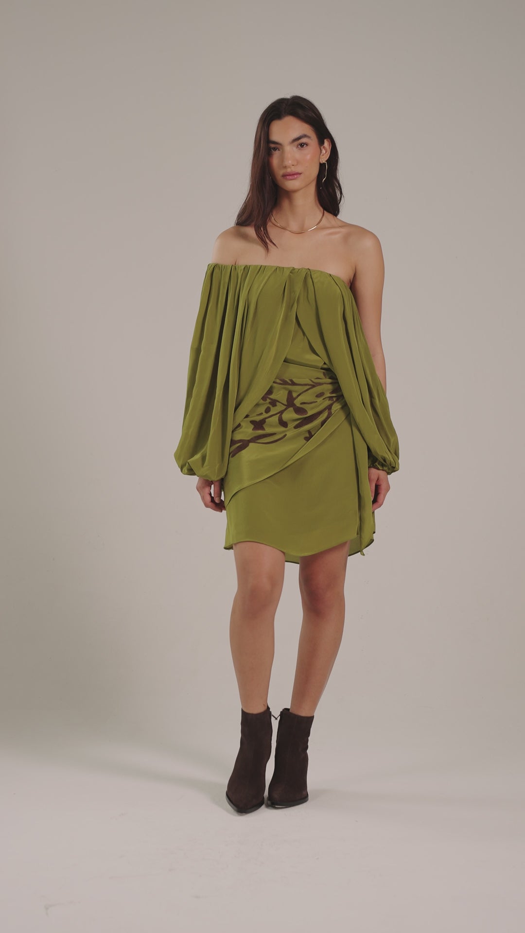 O Vestido Serena é confeccionado em tecido plano leve e fluido, com acabamento brilhante e toque sofisticado. Seu caimento elegante, aliado à leveza e ao aspecto luminoso, confere refinamento e movimento à peça. Apresenta modelagem ombro a ombro, mais solta ao corpo, com elástico no decote que garante conforto e firmeza. As sobreposições com leve transpasse seguem em direção às mangas, criando um visual delicado. As mangas possuem punho com elástico, proporcionando ajuste suave. O efeito de camadas adiciona ainda mais fluidez e leveza ao design, tornando a peça feminina e elegante.